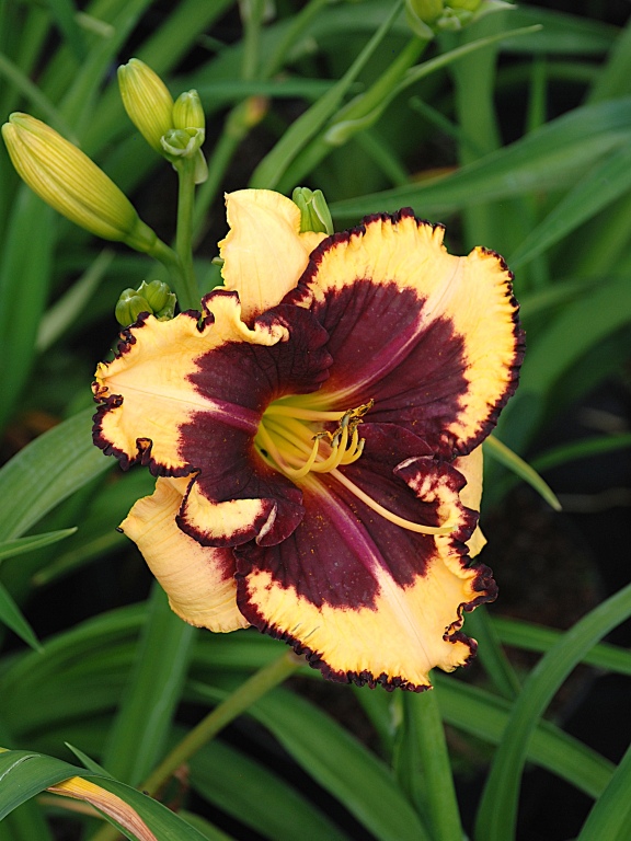 Kępiasta bylina, dorastająca do 0,5-0,7 m wysokości. Liście jasnozielone, łukowato wygięte, w łagodne zimy część liści nie zasycha. Okrągłe pędy kwiatostanowe pojawiają się w VII-VIII. Kwiaty lejkowate, duże, kremowożółte, z dużym purpurowym oczkiem i zieloną gardzielą. Brzegi płatków pofalowane i również purpurowe. Niewymagająca roślina na stanowiska słoneczne i półcieniste. Preferuje gleby żyzne, próchnicze, lekko kwaśne do obojętnych i umiarkowanie wilgotne. Jednak na słabszych glebach też sobie świetnie radzi.